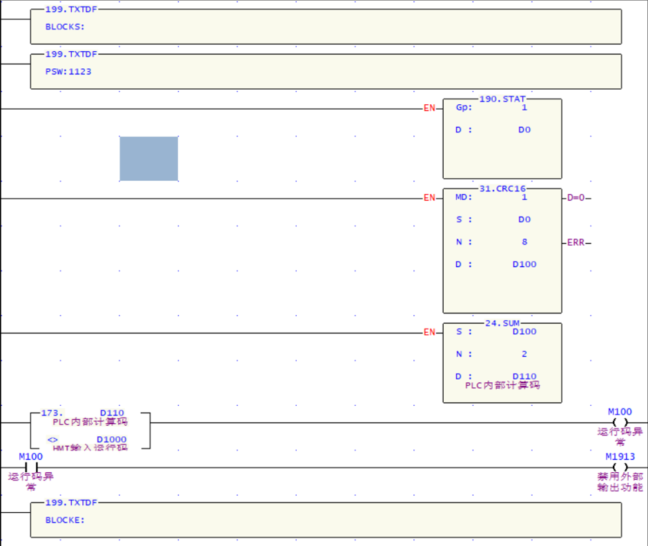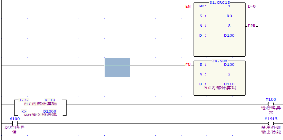 例如下圖將D0~D7使用CRC16方式計算,再對應(yīng)校驗碼進行合計 方式組合的計算加密方式(也可以自行設(shè)計各種加密類型,如加減乘除等運算), 還可達成在HMI需要輸入對應(yīng)的加密內(nèi)容才能正常運行,否則禁止運行等形式均可。 如圖是采用M1913的特殊繼電器的方式,禁止外部Y點信號輸出的方式來限制PLC的運行。